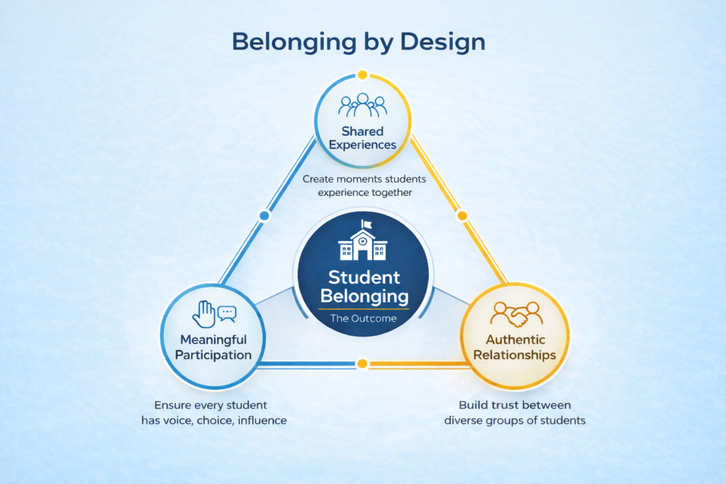 The Belonging by Design Framework identifies three structural conditions that schools can build to foster authentic student belonging across campus.